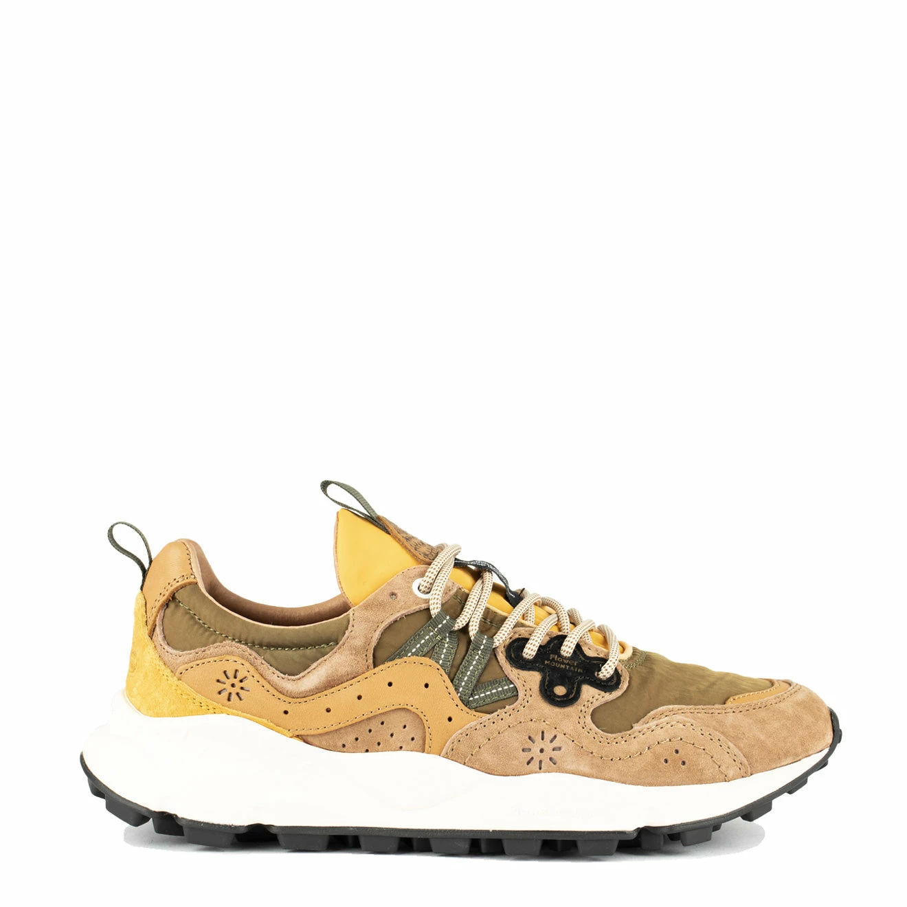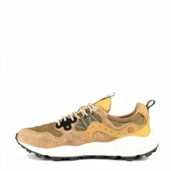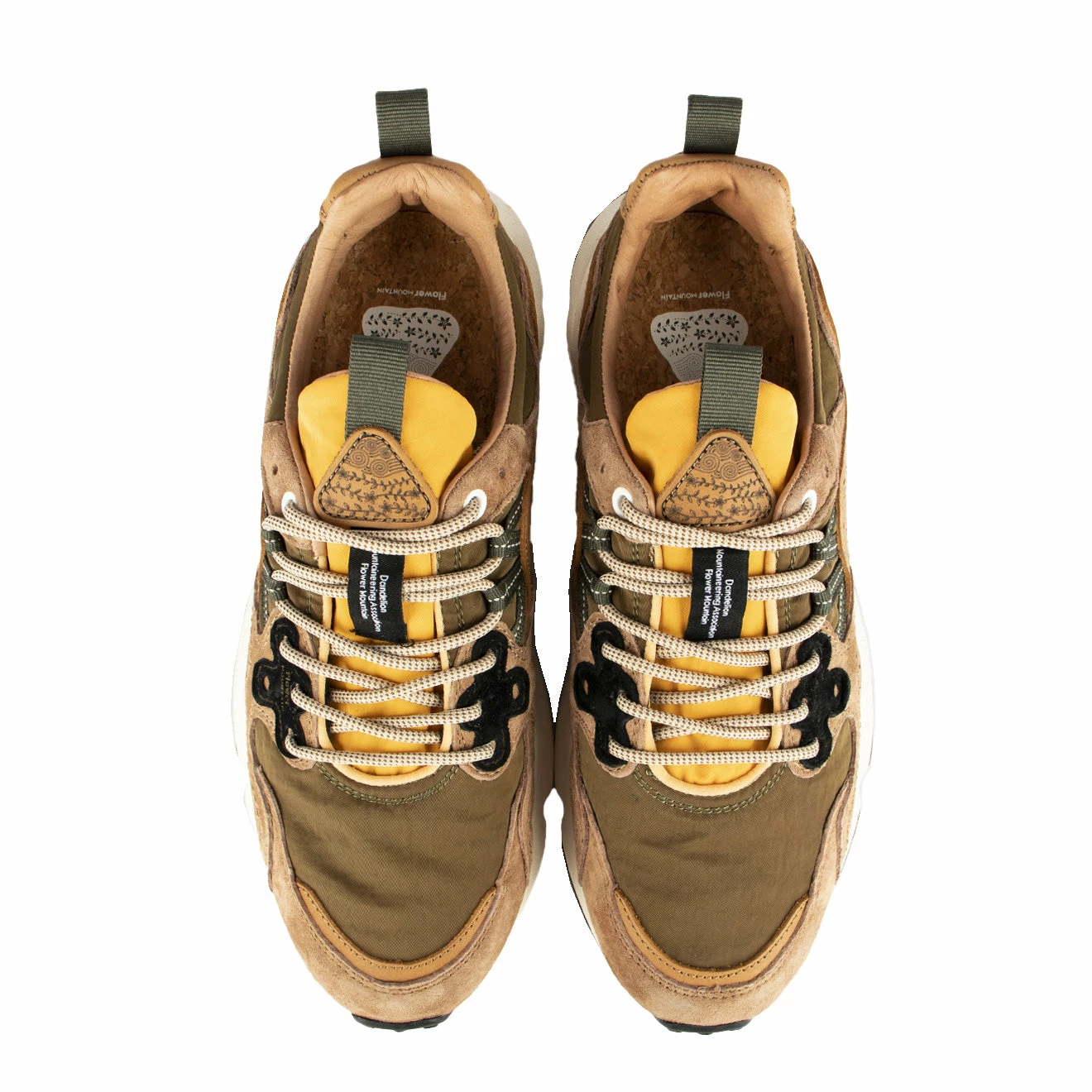 The Flower Mountain Yamano 3 Man in Brown / Military is a technical trainer, decorated with bright colours and features reinforced lacing, and a natural cork insole.